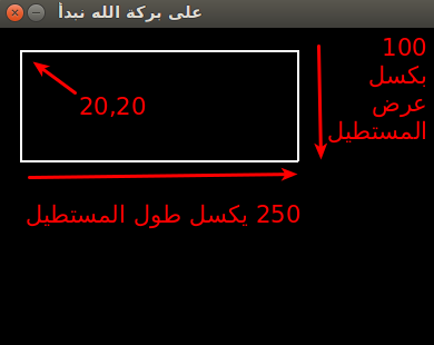 الصورة تظهر لنا المستطيل التي قمت بانشاءه بالاحداثيات التالية [20,20,250,100] حيث تمثل كل من 20 20 احداثية الزاوية العليا اليسرى ومنها يبدأ البرنامج برسم المستطيل ولكي تقوم بتحديد تلك الزاوية فقط تخيل النافذة كمعلم متعامد متجانس وعليك بتحديد احداثية (x,y) كما في الرياضيات.